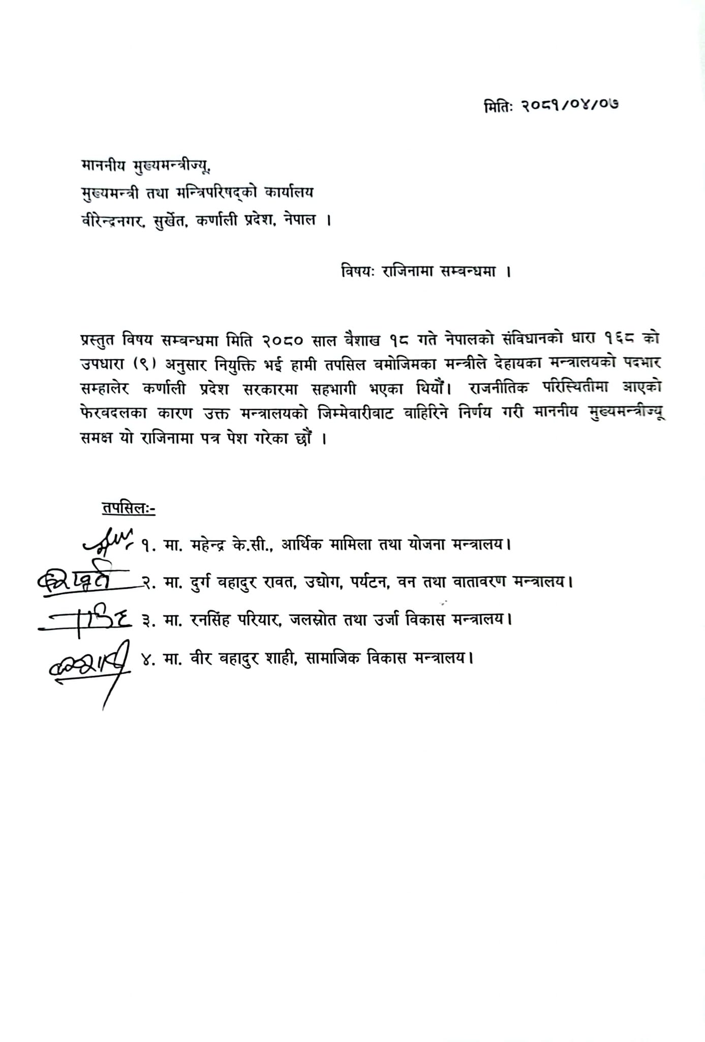 मन्त्रीहरुले मुख्यमन्त्री यामलाल कँडेलसमक्ष राजीनामा पत्र बुझाएका छन् । मुख्यमन्त्री कँडेलको नेतृत्वमा कर्णाली प्रदेश सरकारमा